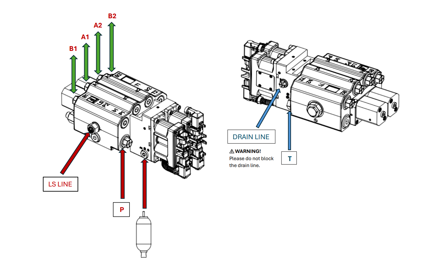 - Skontrolujte, či línie T (nádrž) a P (tlak) sú pripojené a správne fungujú.